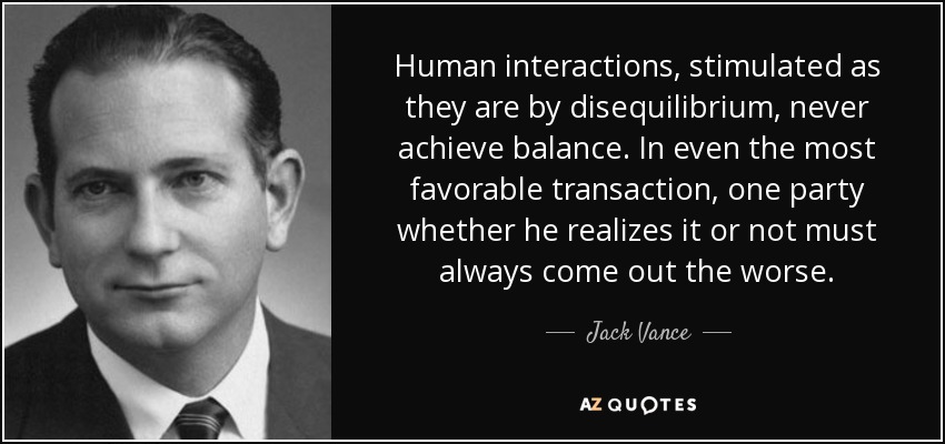 Human interactions, stimulated as they are by disequilibrium, never achieve balance. In even the most favorable transaction, one party whether he realizes it or not must always come out the worse.