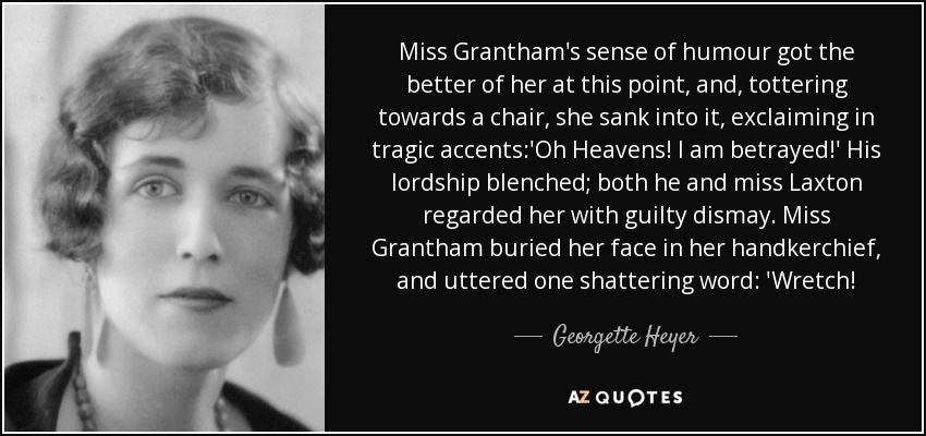 Miss Grantham's sense of humour got the better of her at this point, and, tottering towards a chair, she sank into it, exclaiming in tragic accents:'Oh Heavens! I am betrayed!' His lordship blenched; both he and miss Laxton regarded her with guilty dismay. Miss Grantham buried her face in her handkerchief, and uttered one shattering word: 'Wretch!