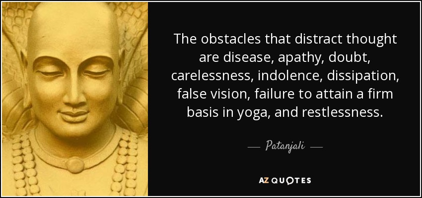The obstacles that distract thought are disease, apathy, doubt, carelessness, indolence, dissipation, false vision, failure to attain a firm basis in yoga, and restlessness.