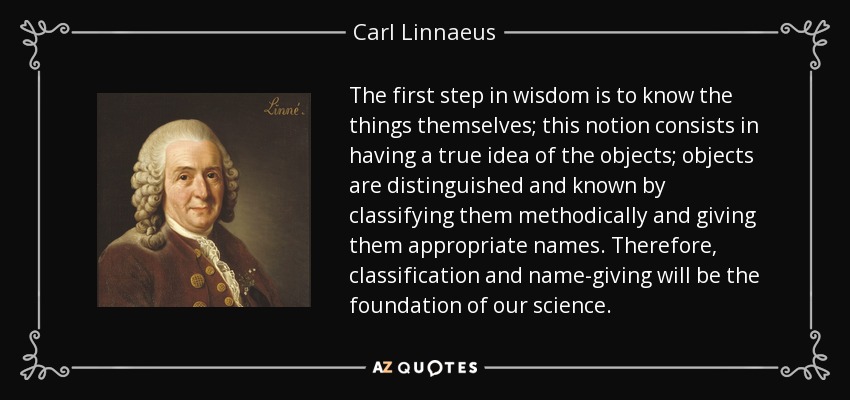The first step in wisdom is to know the things themselves; this notion consists in having a true idea of the objects; objects are distinguished and known by classifying them methodically and giving them appropriate names. Therefore, classification and name-giving will be the foundation of our science.