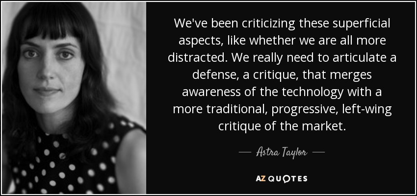 We've been criticizing these superficial aspects, like whether we are all more distracted. We really need to articulate a defense, a critique, that merges awareness of the technology with a more traditional, progressive, left-wing critique of the market.