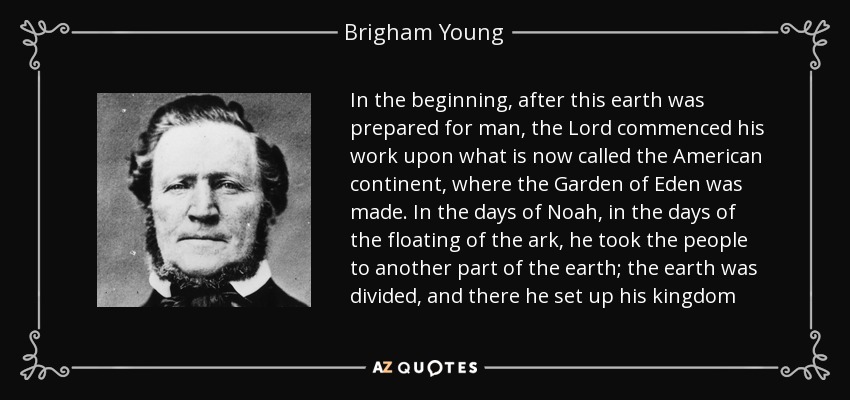 In the beginning, after this earth was prepared for man, the Lord commenced his work upon what is now called the American continent, where the Garden of Eden was made. In the days of Noah, in the days of the floating of the ark, he took the people to another part of the earth; the earth was divided, and there he set up his kingdom