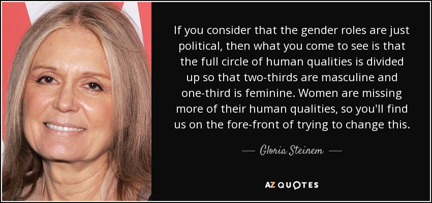 If you consider that the gender roles are just political, then what you come to see is that the full circle of human qualities is divided up so that two-thirds are masculine and one-third is feminine. Women are missing more of their human qualities, so you'll find us on the fore-front of trying to change this.