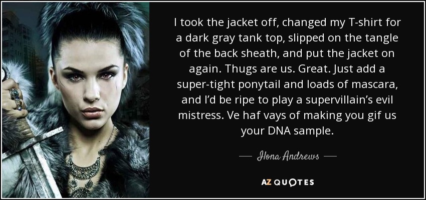 I took the jacket off, changed my T-shirt for a dark gray tank top, slipped on the tangle of the back sheath, and put the jacket on again. Thugs are us. Great. Just add a super-tight ponytail and loads of mascara, and I’d be ripe to play a supervillain’s evil mistress. Ve haf vays of making you gif us your DNA sample.