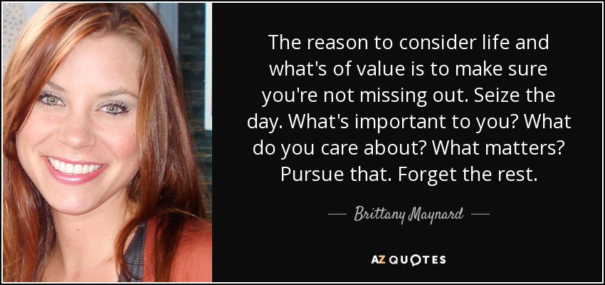 The reason to consider life and what's of value is to make sure you're not missing out. Seize the day. What's important to you? What do you care about? What matters? Pursue that. Forget the rest.