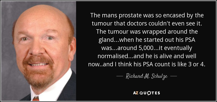 The mans prostate was so encased by the tumour that doctors couldn't even see it. The tumour was wrapped around the gland...when he started out his PSA was...around 5,000...it eventually normalised...and he is alive and well now..and I think his PSA count is like 3 or 4.
