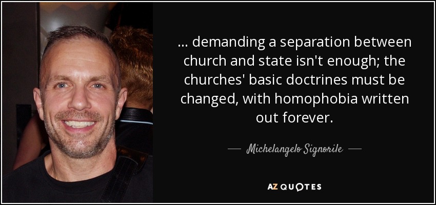 ... demanding a separation between church and state isn't enough; the churches' basic doctrines must be changed, with homophobia written out forever.