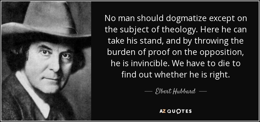 No man should dogmatize except on the subject of theology. Here he can take his stand, and by throwing the burden of proof on the opposition, he is invincible. We have to die to find out whether he is right.