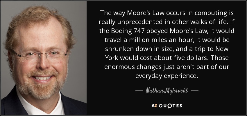 The way Moore's Law occurs in computing is really unprecedented in other walks of life. If the Boeing 747 obeyed Moore's Law, it would travel a million miles an hour, it would be shrunken down in size, and a trip to New York would cost about five dollars. Those enormous changes just aren't part of our everyday experience.