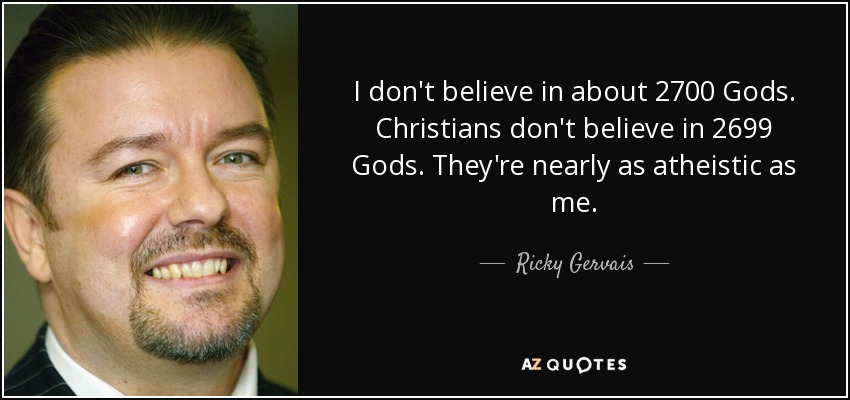 Next time someone tells me they believe in God, I'll say 'Oh which one? Zeus? Hades? Jupiter? Mars? Odin? Thor? Krishna? Vishnu? Ra?...' If they say 'Just God. I only believe in the one God,' I'll point out that they are nearly as atheistic as me. I don't believe in 2,870 gods, and they don't believe in 2,869.