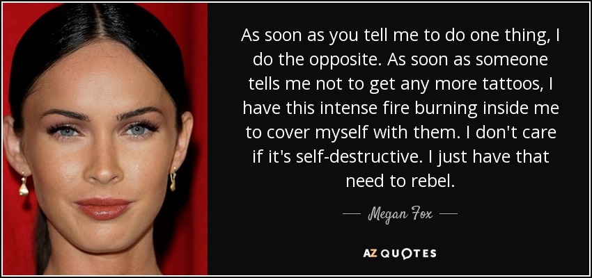 As soon as you tell me to do one thing, I do the opposite. As soon as someone tells me not to get any more tattoos, I have this intense fire burning inside me to cover myself with them. I don't care if it's self-destructive. I just have that need to rebel.
