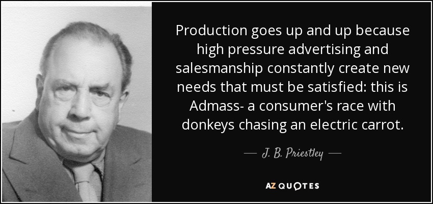 Production goes up and up because high pressure advertising and salesmanship constantly create new needs that must be satisfied: this is Admass- a consumer's race with donkeys chasing an electric carrot.