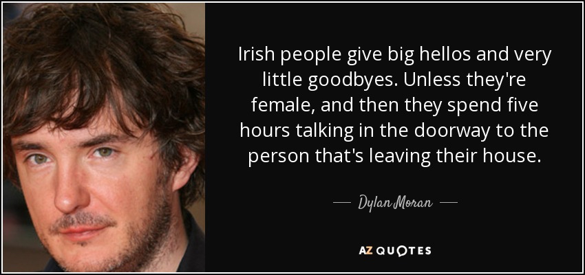 Irish people give big hellos and very little goodbyes. Unless they're female, and then they spend five hours talking in the doorway to the person that's leaving their house.