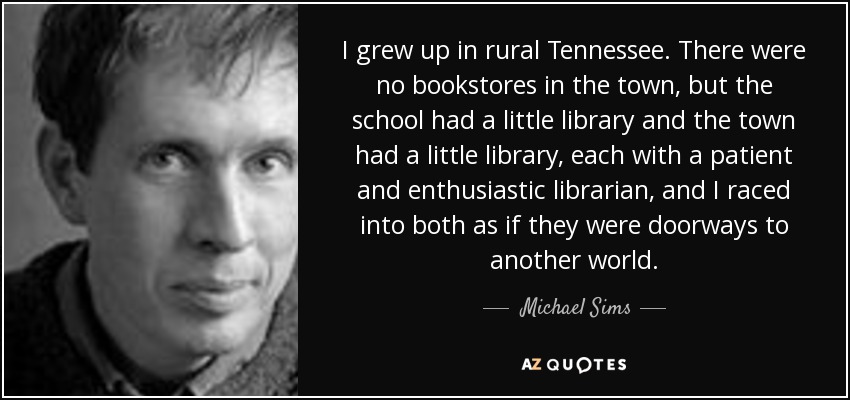 I grew up in rural Tennessee. There were no bookstores in the town, but the school had a little library and the town had a little library, each with a patient and enthusiastic librarian, and I raced into both as if they were doorways to another world.