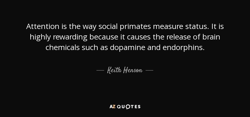 Attention is the way social primates measure status. It is highly rewarding because it causes the release of brain chemicals such as dopamine and endorphins.