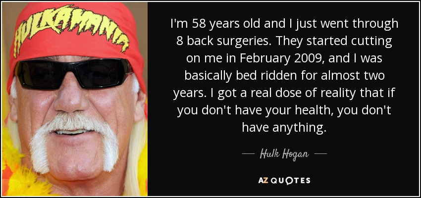 I'm 58 years old and I just went through 8 back surgeries. They started cutting on me in February 2009, and I was basically bed ridden for almost two years. I got a real dose of reality that if you don't have your health, you don't have anything.