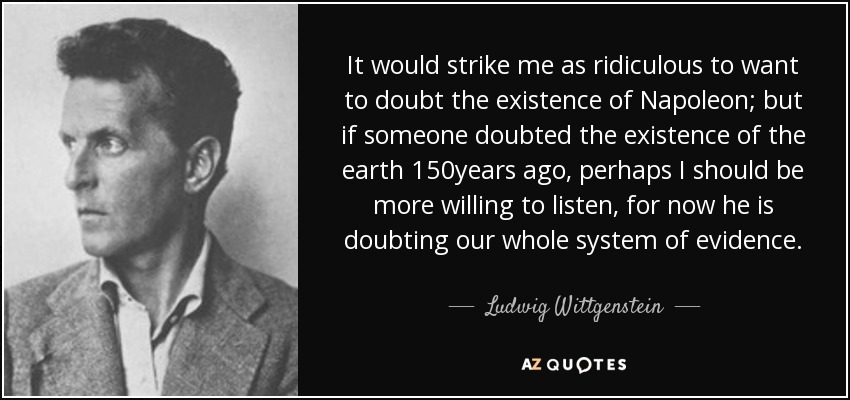 It would strike me as ridiculous to want to doubt the existence of Napoleon; but if someone doubted the existence of the earth 150years ago, perhaps I should be more willing to listen, for now he is doubting our whole system of evidence.