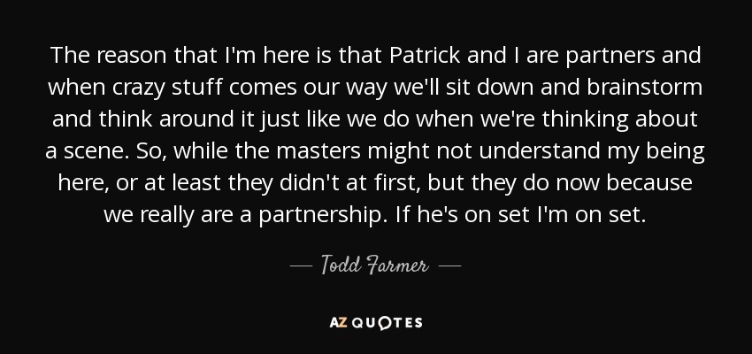 The reason that I'm here is that Patrick and I are partners and when crazy stuff comes our way we'll sit down and brainstorm and think around it just like we do when we're thinking about a scene. So, while the masters might not understand my being here, or at least they didn't at first, but they do now because we really are a partnership. If he's on set I'm on set.