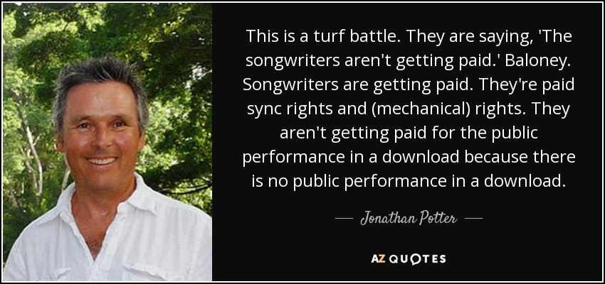 This is a turf battle. They are saying, 'The songwriters aren't getting paid.' Baloney. Songwriters are getting paid. They're paid sync rights and (mechanical) rights. They aren't getting paid for the public performance in a download because there is no public performance in a download.