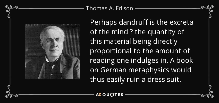 Perhaps dandruff is the excreta of the mind the quantity of this material being directly proportional to the amount of reading one indulges in. A book on German metaphysics would thus easily ruin a dress suit.