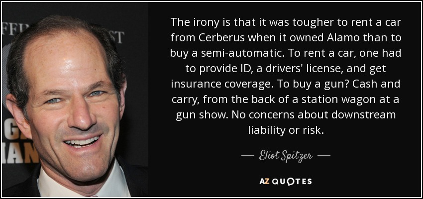 The irony is that it was tougher to rent a car from Cerberus when it owned Alamo than to buy a semi-automatic. To rent a car, one had to provide ID, a drivers' license, and get insurance coverage. To buy a gun? Cash and carry, from the back of a station wagon at a gun show. No concerns about downstream liability or risk.