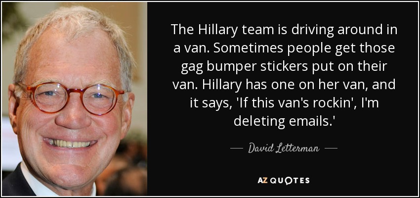 The Hillary team is driving around in a van. Sometimes people get those gag bumper stickers put on their van. Hillary has one on her van, and it says, 'If this van's rockin', I'm deleting emails.'