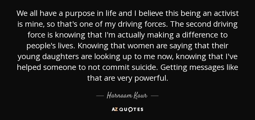 We all have a purpose in life and I believe this being an activist is mine, so that's one of my driving forces. The second driving force is knowing that I'm actually making a difference to people's lives. Knowing that women are saying that their young daughters are looking up to me now, knowing that I've helped someone to not commit suicide. Getting messages like that are very powerful.