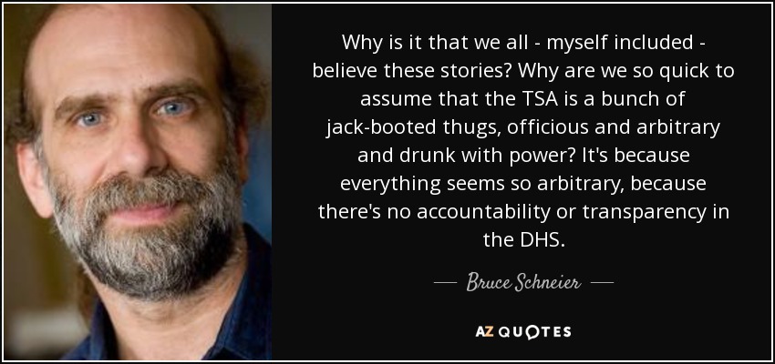 Why is it that we all - myself included - believe these stories? Why are we so quick to assume that the TSA is a bunch of jack-booted thugs, officious and arbitrary and drunk with power? It's because everything seems so arbitrary, because there's no accountability or transparency in the DHS.