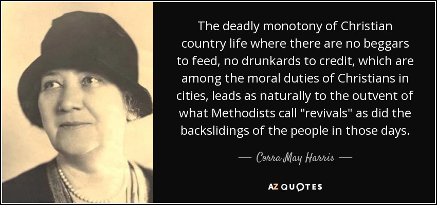 The deadly monotony of Christian country life where there are no beggars to feed, no drunkards to credit, which are among the moral duties of Christians in cities, leads as naturally to the outvent of what Methodists call "revivals" as did the backslidings of the people in those days.