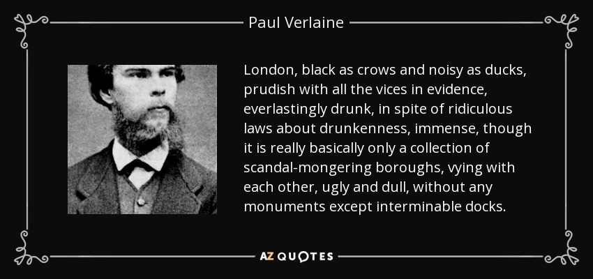 London, black as crows and noisy as ducks, prudish with all the vices in evidence, everlastingly drunk, in spite of ridiculous laws about drunkenness, immense, though it is really basically only a collection of scandal-mongering boroughs, vying with each other, ugly and dull, without any monuments except interminable docks.