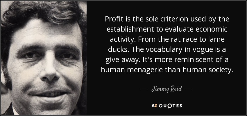 Profit is the sole criterion used by the establishment to evaluate economic activity. From the rat race to lame ducks. The vocabulary in vogue is a give-away. It's more reminiscent of a human menagerie than human society.