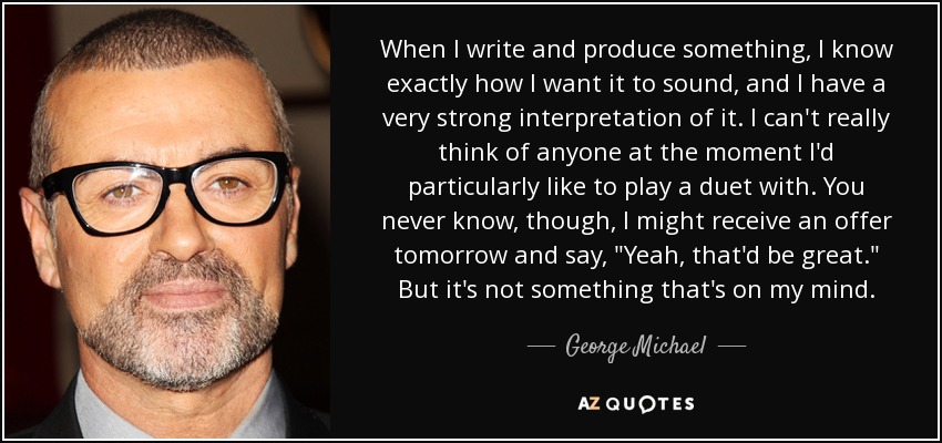 When I write and produce something, I know exactly how I want it to sound, and I have a very strong interpretation of it. I can't really think of anyone at the moment I'd particularly like to play a duet with. You never know, though, I might receive an offer tomorrow and say, "Yeah, that'd be great." But it's not something that's on my mind.