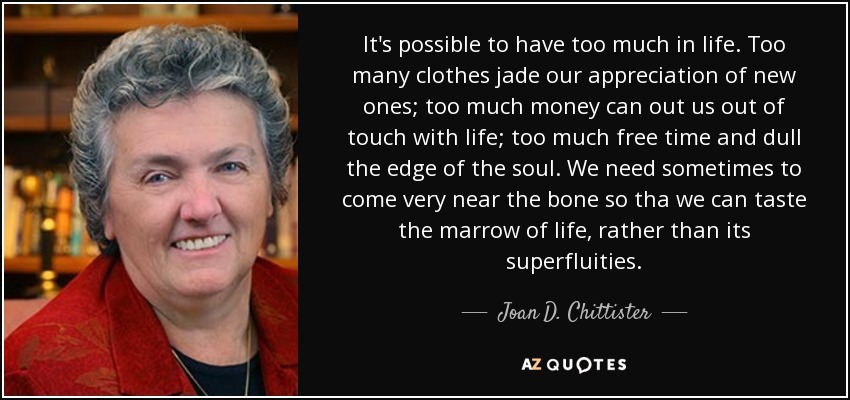 It's possible to have too much in life. Too many clothes jade our appreciation of new ones; too much money can out us out of touch with life; too much free time and dull the edge of the soul. We need sometimes to come very near the bone so tha we can taste the marrow of life, rather than its superfluities.