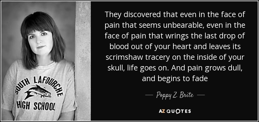 They discovered that even in the face of pain that seems unbearable, even in the face of pain that wrings the last drop of blood out of your heart and leaves its scrimshaw tracery on the inside of your skull, life goes on. And pain grows dull, and begins to fade
