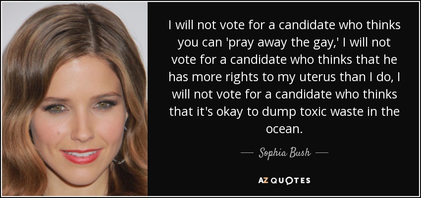 I will not vote for a candidate who thinks you can 'pray away the gay,' I will not vote for a candidate who thinks that he has more rights to my uterus than I do, I will not vote for a candidate who thinks that it's okay to dump toxic waste in the ocean.