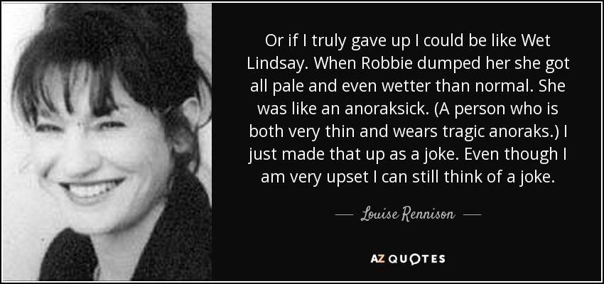 Or if I truly gave up I could be like Wet Lindsay. When Robbie dumped her she got all pale and even wetter than normal. She was like an anoraksick. (A person who is both very thin and wears tragic anoraks.) I just made that up as a joke. Even though I am very upset I can still think of a joke.