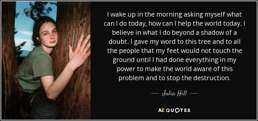 I wake up in the morning asking myself what can I do today, how can I help the world today. I believe in what I do beyond a shadow of a doubt. I gave my word to this tree and to all the people that my feet would not touch the ground until I had done everything in my power to make the world aware of this problem and to stop the destruction.
