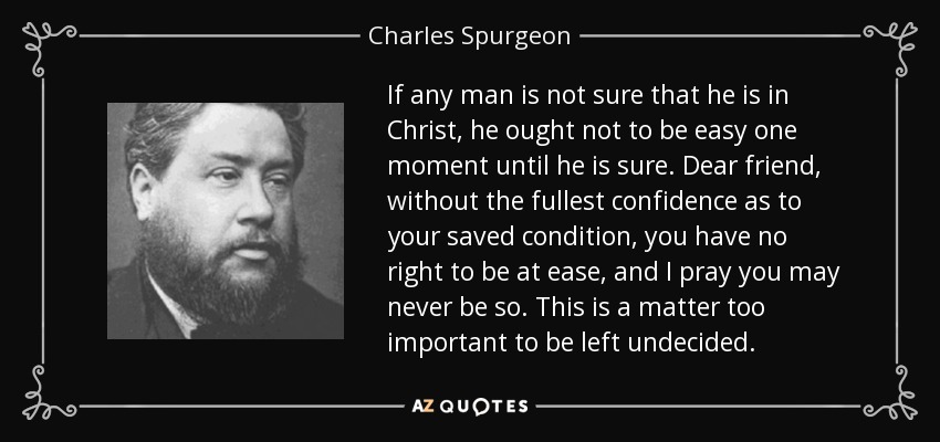 If any man is not sure that he is in Christ, he ought not to be easy one moment until he is sure. Dear friend, without the fullest confidence as to your saved condition, you have no right to be at ease, and I pray you may never be so. This is a matter too important to be left undecided.
