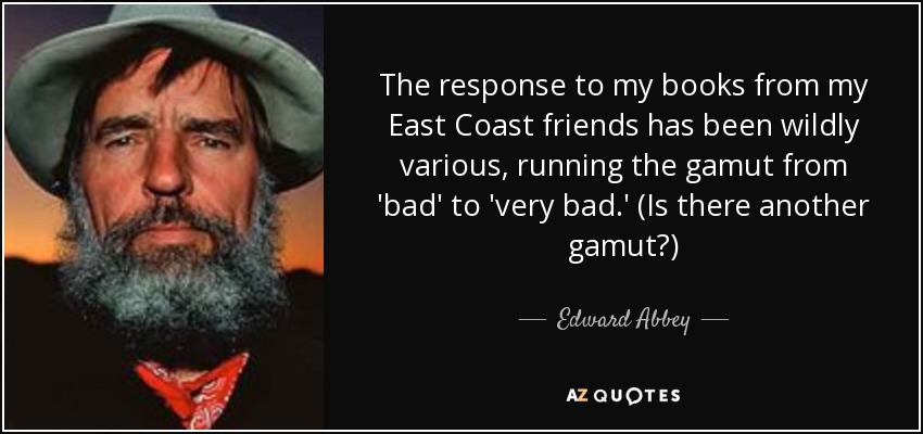 The response to my books from my East Coast friends has been wildly various, running the gamut from 'bad' to 'very bad.' (Is there another gamut?)