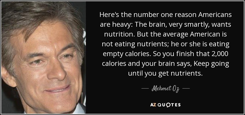 Here's the number one reason Americans are heavy: The brain, very smartly, wants nutrition. But the average American is not eating nutrients; he or she is eating empty calories. So you finish that 2,000 calories and your brain says, Keep going until you get nutrients.