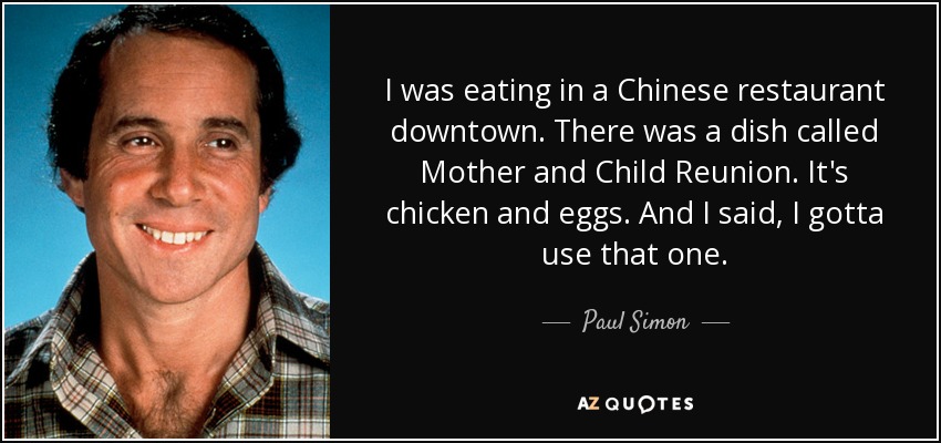 I was eating in a Chinese restaurant downtown. There was a dish called Mother and Child Reunion. It's chicken and eggs. And I said, I gotta use that one.