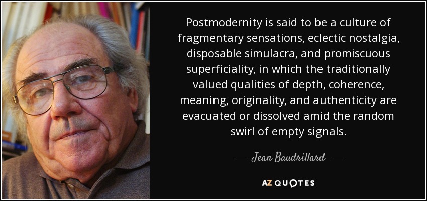Postmodernity is said to be a culture of fragmentary sensations, eclectic nostalgia, disposable simulacra, and promiscuous superficiality, in which the traditionally valued qualities of depth, coherence, meaning, originality, and authenticity are evacuated or dissolved amid the random swirl of empty signals.