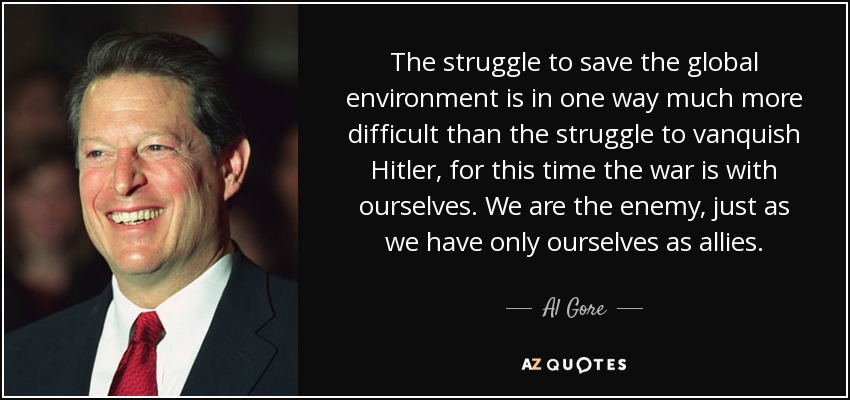 The struggle to save the global environment is in one way much more difficult than the struggle to vanquish Hitler, for this time the war is with ourselves. We are the enemy, just as we have only ourselves as allies.