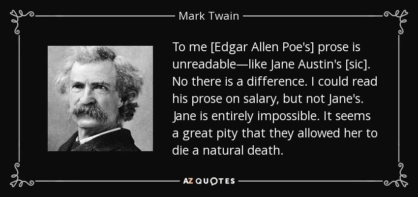 To me [Edgar Allen Poe's] prose is unreadable—like Jane Austin's [sic]. No there is a difference. I could read his prose on salary, but not Jane's. Jane is entirely impossible. It seems a great pity that they allowed her to die a natural death.
