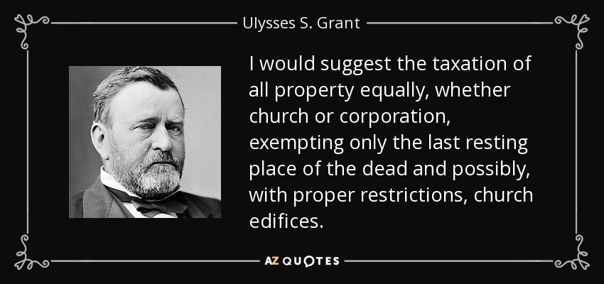 I would suggest the taxation of all property equally, whether church or corporation, exempting only the last resting place of the dead and possibly, with proper restrictions, church edifices.