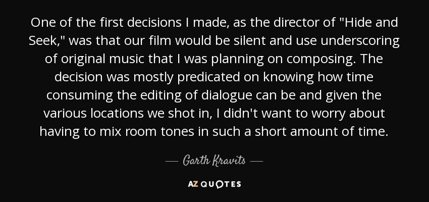 One of the first decisions I made, as the director of "Hide and Seek," was that our film would be silent and use underscoring of original music that I was planning on composing. The decision was mostly predicated on knowing how time consuming the editing of dialogue can be and given the various locations we shot in, I didn't want to worry about having to mix room tones in such a short amount of time.