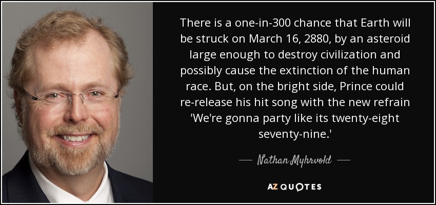 There is a one-in-300 chance that Earth will be struck on March 16, 2880, by an asteroid large enough to destroy civilization and possibly cause the extinction of the human race. But, on the bright side, Prince could re-release his hit song with the new refrain 'We're gonna party like its twenty-eight seventy-nine.'
