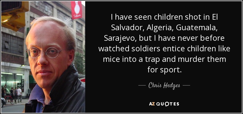 I have seen children shot in El Salvador, Algeria, Guatemala, Sarajevo, but I have never before watched soldiers entice children like mice into a trap and murder them for sport.