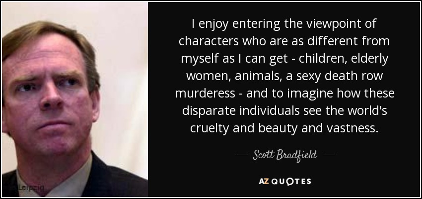 I enjoy entering the viewpoint of characters who are as different from myself as I can get - children, elderly women, animals, a sexy death row murderess - and to imagine how these disparate individuals see the world's cruelty and beauty and vastness.