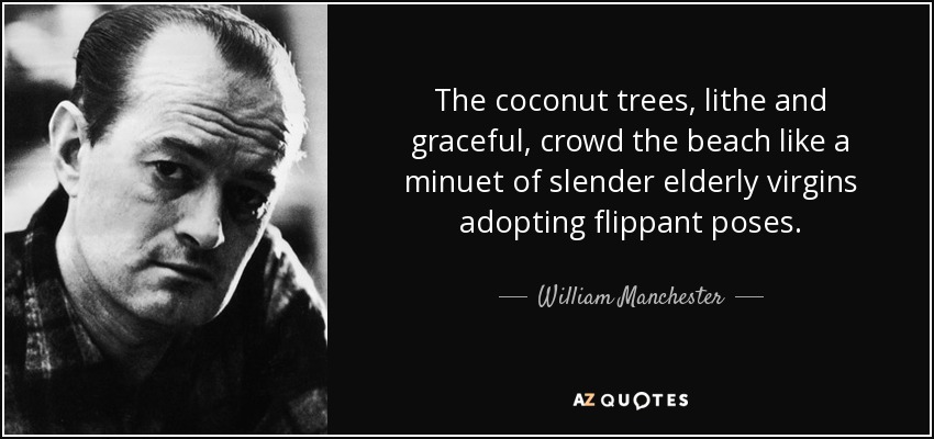 The coconut trees, lithe and graceful, crowd the beach like a minuet of slender elderly virgins adopting flippant poses.